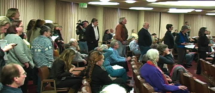 [ Left: Citizens line up to speak in favor of ban on wireless meters. ]